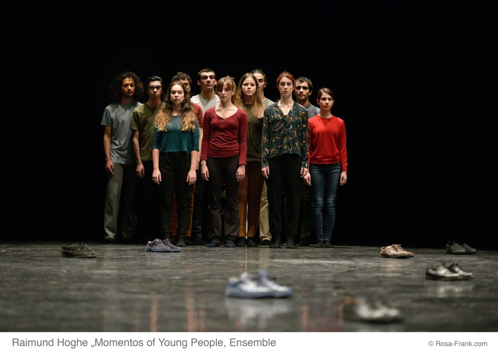 Encore une affaire de temps qui passe « si vite », trop vite… Lors de l’édition du Festival Montpellier Danse de 2004, Raimund Hoghe avait créé une pièce pour douze jeunes danseurs amateurs et professionnels, intitulée Young People Old Voices. Aujourd’hui ces vieilles voix, éternelles, celles de Léo Ferré, Jacques Brel ou Dalida, restent mais le casting, lui, a changé. En 2004, ces 12 jeunes danseurs de France et du Portugal venaient à peine de naître, aujourd’hui, ils partagent le plateau avec Raimund Hoghe pour ce « Moment of Young People » créée à Porto en 2018. Le prénom de chaque interprète est égrainé par le chorégraphe seul sur le plateau. Un par un, les danseurs entrent et se placent à l’avant-scène. Dans un traitement cyclique du temps, rempli d’épisodes de décompte, celui du tempo ou de la clepsydre, Raimund Hoghe évoque la tension de l’éternel retour. De la ligne frontale des danseurs en avant-scène en passant par les jeux d’enfants, la séduction adolescente, la contrainte scolaire et la sensation, en creux, d’un sacre du printemps, « Moment of Young People » déploie un rythme lent et continu avant de se clore par un retour vers l’avant-scène remplie des chaussures vides des interprètes, abandonnées entre temps, et qui attendent d’être à nouveau habitées. Malgré la nostalgie de la proposition peuplée des musiques de Léo Ferré (« Avec le temps va tout s’en va ») ou de Jacques Brel (« Mon enfance passa »), il s’agit bel et bien d’une œuvre à la force vive, celle de la jeunesse, de l’éternel retour nietzschéen, du cycle qui veut que chaque mort annonce une vie nouvelle… Même si, la lumière s’éteignant avant que l’objectif de repeupler les paires de chaussures ne soit atteint, nous savons que cette vie nouvelle ne sera pas une résurrection, ni le retour du même…