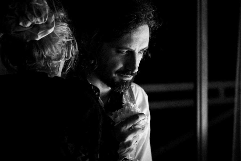 Julien Gosselin joue avec les mythes de l’Europe : il y a comme une nostalgie des apparences, des salons, des discussions littéraires, de la vitalité culturelle de la Vienne de ce début de XXème siècle. Et il y a cet arrière-goût d’apocalypse qui approche, de catastrophe imminente, d’empire déchu et de décadence. Il flotte dans l’air comme un relent du marquis de Sade. La lucidité des protagonistes réveille leur pulsion de mort, leur cruauté. Ielles portent, en ielles, les ferments de la destruction : la catastrophe est endogène. Il y a les costumes, les coiffes, l’argenterie. Il y a la classe bourgeoise et cultivée, il y a Freud, Mahler, Schönberg, l’alcool et la sexualité. Il y a quelque chose qui vomit, éjacule, pleure, parle, chie, saigne, déborde. Et des restes de ces excès, on s’en essuie le gland ou le coin de la bouche dans un joli mouchoir de soie. Il y a le fiel et la dentelle, le satin et le sang, l’odeur de la putréfaction sous la dorure des masques. Les protagonistes sont sur le seuil de cette vieille Europe, à deux pas du gouffre. La rampe devient ligne de crête ; elle accueille une rangée de flammes, elle marque l’étroit couloir qui nous sépare de cette ancienne Autriche dont nous ne pouvons avoir que des images d’archive, des images filmées, des images médiatisées. Impossible de voir ce qui n’est plus.