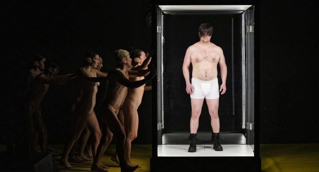 Le monde entre en scène, il est grotesque, monstrueux, carnavalesque : 8 interprètes en justaucorps à paillettes, 8 pantins plus désarticulés que la poupée Chucky. Leurs oreilles démesurées en font des sortes de gobelins ; créatures légendaires anthropomorphes de petite taille, issues du folklore médiéval européen. Humanoïde, la figure du gobelin fait la passerelle entre le patrimoine littéraire et la culture pop ; entre Victor Hugo qui en fait mention dans le chapitre 3, livre 2 de la 4e partie des Misérables, et J. R. R. Tolkien qui, dans Bilbo le Hobbit, désigne par ce terme une créature maléfique vivant sous les monts Brumeux – Mont brumeux qui sera recréé, un instant, dans la pente de la salle du théâtre Jean-Claude Carrière, lors d’un tour de passe-passe fait de brouillard et de lumière. Mont-brumeux, Mont-lacrymo, Mont-fumigène…