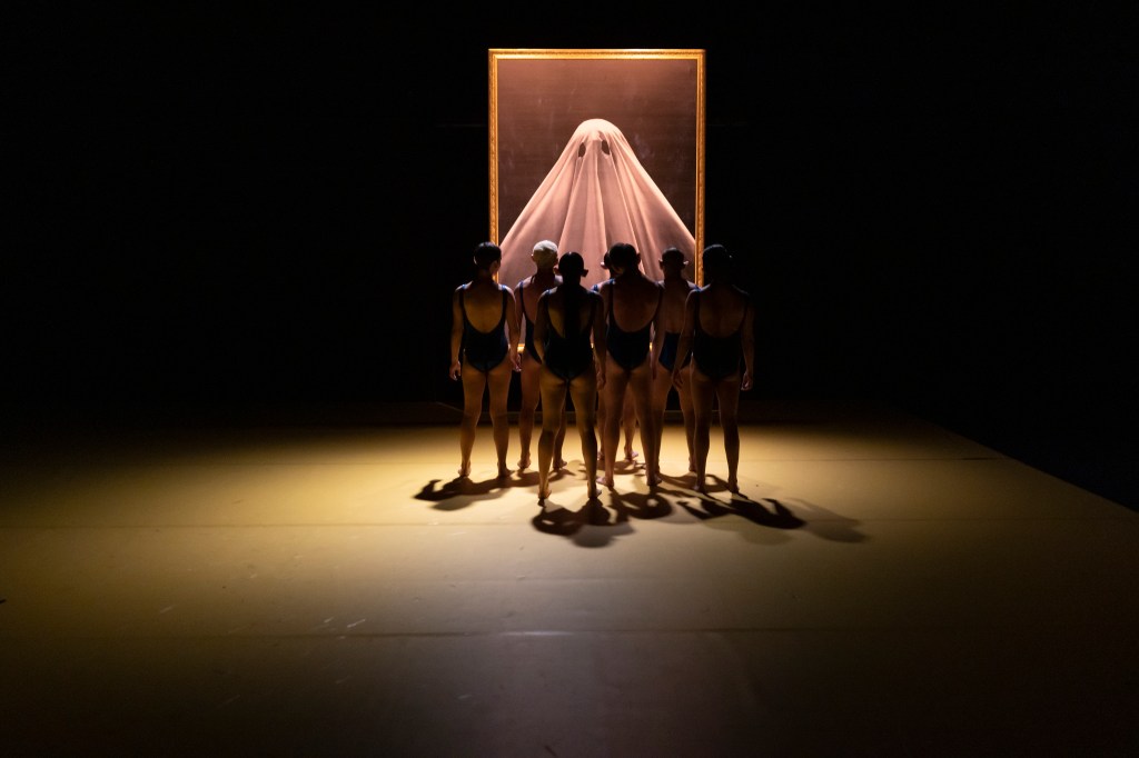 Tout se passe sous le regard du spectre, figure d’un héritage idéologique qui masque son visage et qui exige qu’on lui fasse allégeance. Ses yeux creux de Big Brother surplombant le plateau dans son cadre doré, en font l’autorité de Dieu, de l’Eglise, du capital, de la dictature militaire, du patriarcat, etc. Tous les visages de la même domination en un seul, recouvert du voile blanc de la tradition.