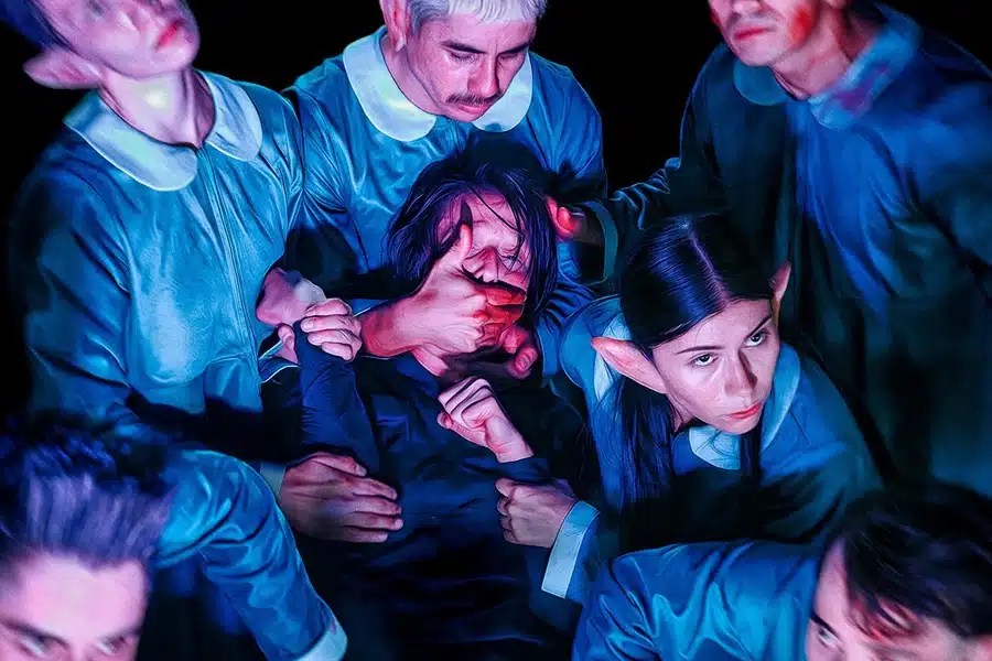 Musique latine aux accents lyriques, faux sang, musique électro, fausses dents arrachées, basses au taquet à en faire trembler les fauteuils, cercueil en carton pâte, cri déchirant, fleurs en plastique, Bane de l’univers DC dans une boite en plexi justifiant les violences policières, Freddy Krueger aux griffes aiguisées suppliant qu’enfin cela s’arrête : Oasis de la impunitad s’apparente à un spectacle de clown trash. Dit comme ça, ça a l’air de faire beaucoup. Et en effet, c’est baroque à souhait, mais c’est jamais “too much” ; car dans ce kitch assumé, notre œil sidéré est tenu par l’étonnament parfaite précision des interprètes.