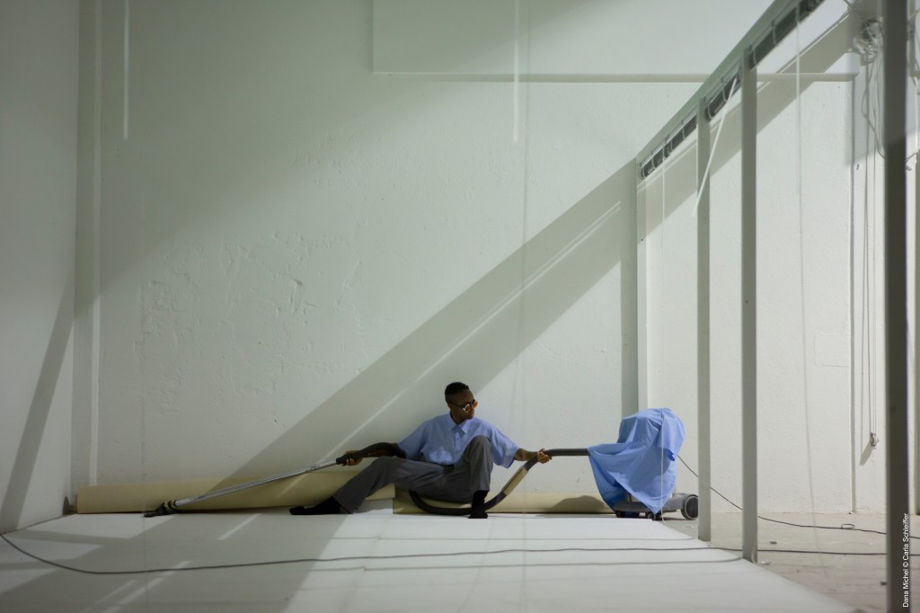 Travaillant sur la durée avec le même génie que Chantal Akerman lorsqu’elle réalisait, en 1975, « Jeanne Dielman » interprétée par Delphine Seyrig, Dana Michel aborde la question du travail. Nous nous installons, librement, dans la salle Béjart. La journée de travail se prépare : un réveil difficile, un café, un passage aux toilettes à l’autre bout de la cour de l’Agora, une chaussette, puis l’autre, etc. Dana Michel part, revient, traficote quelques trucs, repart. Son corps fonctionne comme une caméra en travelling, nous la suivons du regard, nous la suivons dans la cour, nous la suivons dans la salle, nous nous rapprochons, nous tenons la distance, nous fabriquons des points de vue, des plans séquences, des plans rapprochés, des paysages. Nous la perdons parfois et savourons le vide, à moins que le visage d’un.e spectateurice, souriant vers tel ou tel point, nous donne envie d’aller y voir de plus près. Nous ressortons alors et retrouvons Dana Michel allongée dans les bureaux de Montpellier Danse. A côté d’elle, l’équipe travaille, répond au téléphone, etc. Certain.e.s entrent, d’autres restent à la porte, d’autres encore regardent par les fenêtres : peu importe nos choix, nous faisons, nous aussi, partie de l’image et participons ainsi à la fabrique de l’incongru. Il y a ce qu’il faut de bande-son pour imposer notre silence : nos corps de spectateurices se font alors précautionneux. Dana Michel a quelque chose de Buster Keaton, un visage de cinéma muet et un corps d’employé.e – de poste, d’entretien ou de bâtiment – tenant du clown triste qui emprunte les chemins les plus difficiles pour atteindre les buts les plus simples, transformant chaque geste en labeur. Dana Michel interroge la relation de corps à corps que la/le travailleureuse entretient avec son geste : précision, distance, ennuie, expertise, attention. La qualité de présence de Dana Michel est d’une rare justesse ; elle travaille la proximité en évitant l’écueil de l’adresse directe, nous permettant d’habiter l’espace avec elle.