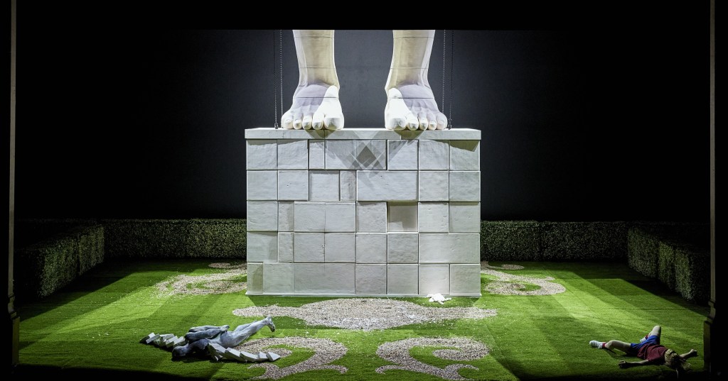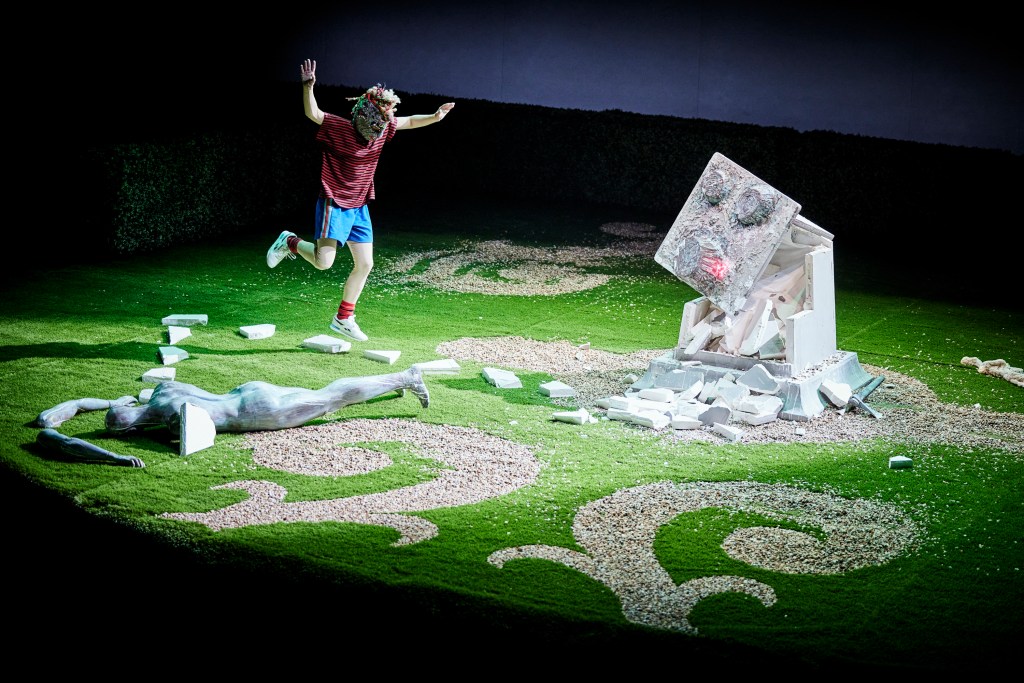La statue s’effondre sous les coups de sa propre hache, version rustique du motif du glaive. Non plus de marbre lourd mais de fortune, la statue tombée au sol se fait radeau. Ce n’est qu’un jeu d’enfant dans un jardin, un désordre de chambre, une réécriture de l’espace scénographique fait de débris et de gravas.