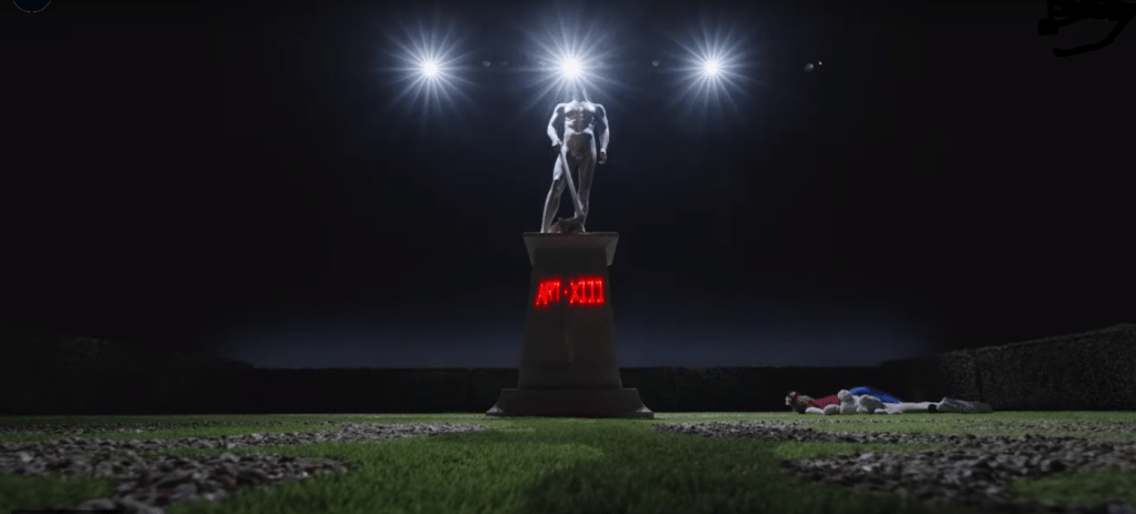 Les agents de l’Eden vêtus de blanc reviennent : à la statue en pied, succède à présent l’écrasante statue, démesurée, dont le socle a la taille d’un mausolée recouvrant le corps de l’enfant. Marion Blondeau le fera imploser, car rien ne résiste au jeu des enfants éternels. Le paysage scénographique devient ruine, les éclairs de chaleur annoncent une averse, la brume envahit le plateau. Une fine pluie de lumière tombe, holographiant le corps, effaçant les contours de son image comme dépixellisée : un scintillement de l’être jusqu’à sa totale disparition, mémoire, feu-follet, compost, boue, photographie oubliée…