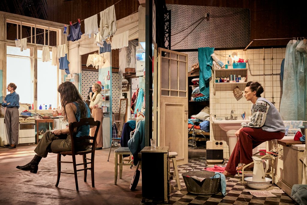 Assises en ligne à l’avant-scène, face au public, les premiers témoignages se font presque timidement. La parole se cherche un peu : elle cherche l’éthos du témoin, le mot juste, la tournure adéquate, avant de se mettre, au fur et à mesure cette quête, à rebondir sur celle des autres, à exister en co-existant. Ces femmes se sont tu pendant si longtemps que la parole semble chercher non pas un souvenir enfoui, car la guerre est toujours là, mais le mot pour la décrire, et avec elle le sentiment, niché quelque part, qui permettrait d’en traduire l’expérience. “Comment faire comprendre ça ?” ponctue à plusieurs reprises plusieurs récits. La salle est éclairée, on pourrait presque croire que ce sont les services qui sont allumés au plateau : il n’y a pas de spectacle.